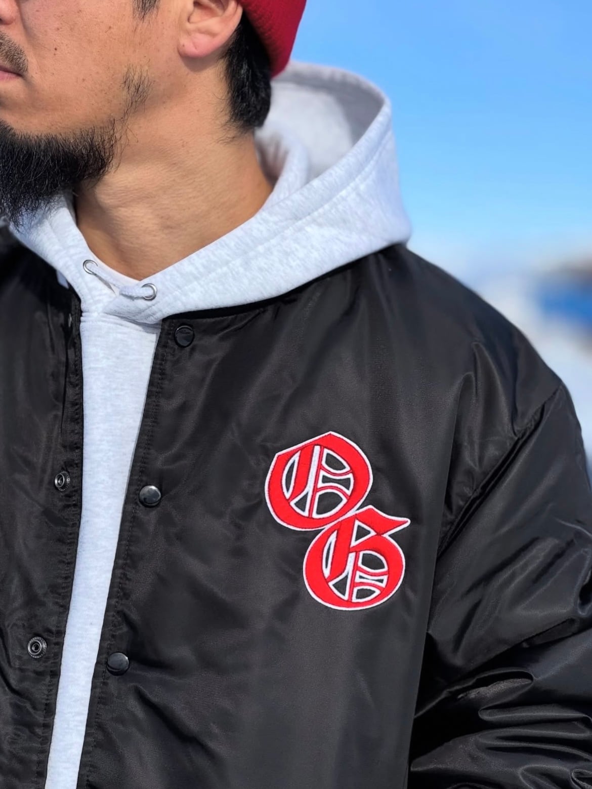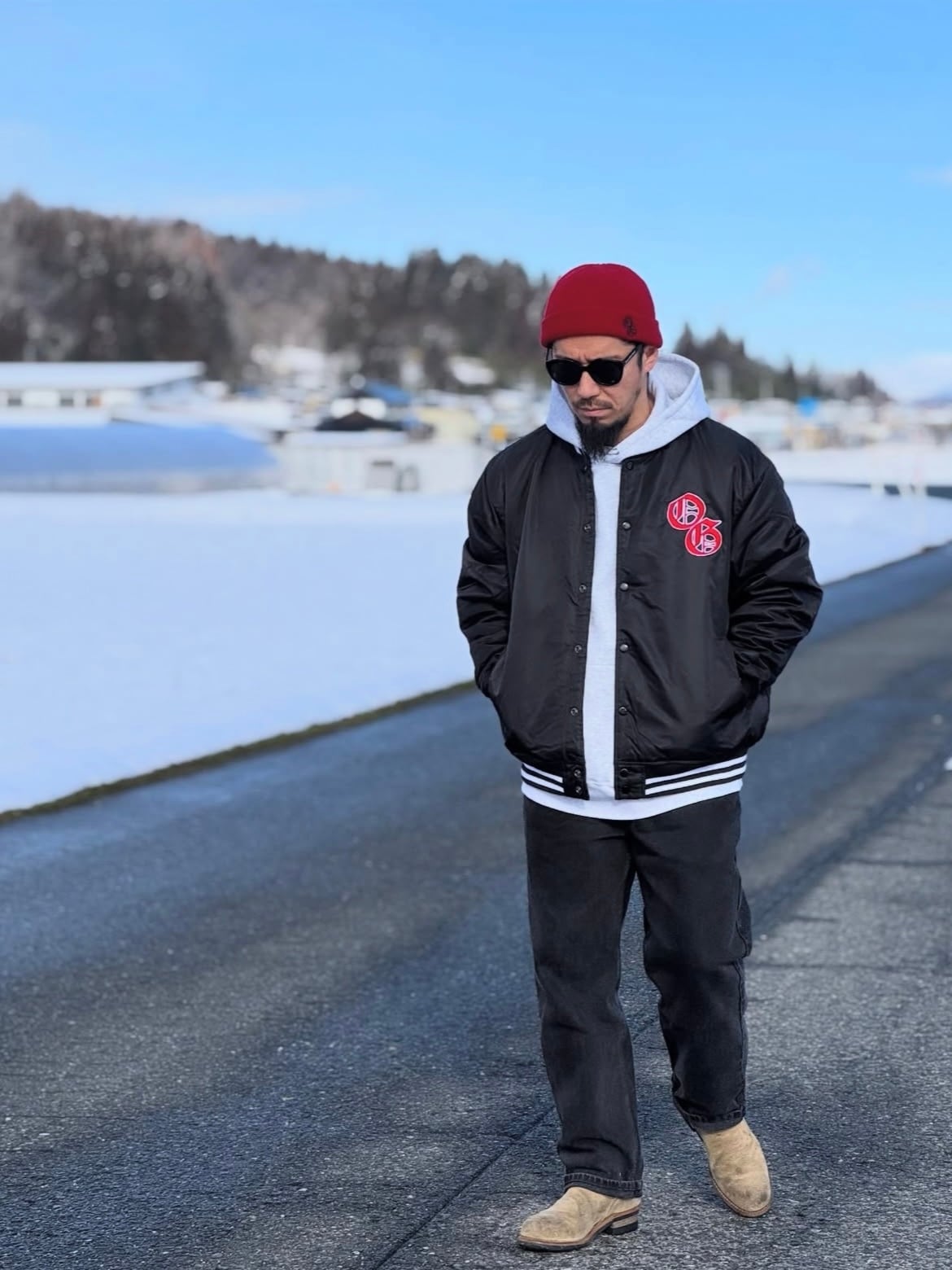 古着のアメリカのメジャーチームスタジャンのような、どことなく懐かしさを感じさせるクラシックな雰囲気で、ブラックボディーに赤白の刺繍ロゴがかなり目立ちますよ。